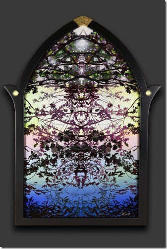 Het is integendeel een gesymmetreerd en gestileerd beeld van een bomenpartij waar doorheen de zon priemt. Op deze manier vormgegeven en gevat in een boograam doet het enigszins denken aan een kerkelijk glasraam. En dat is geen toeval.